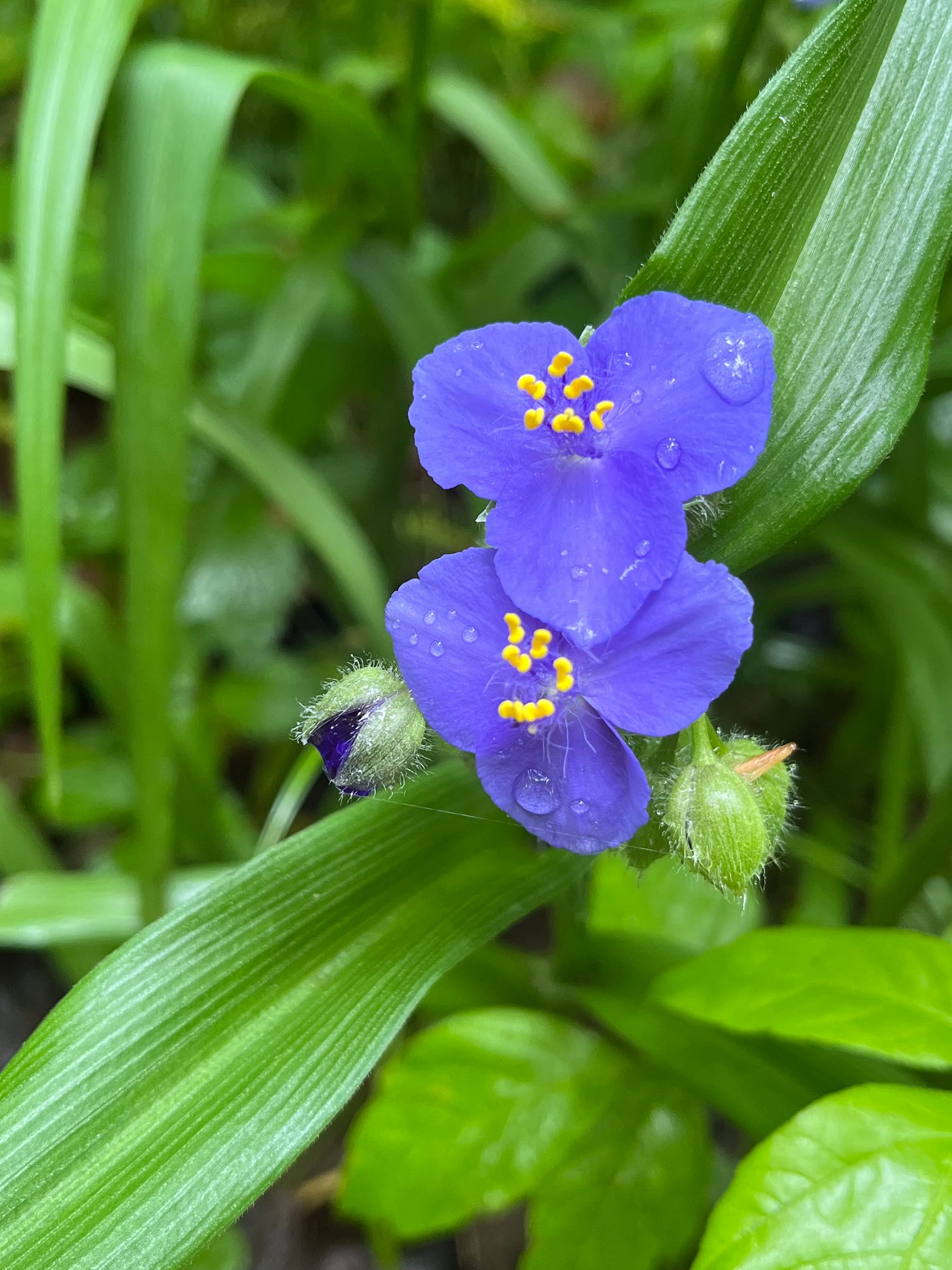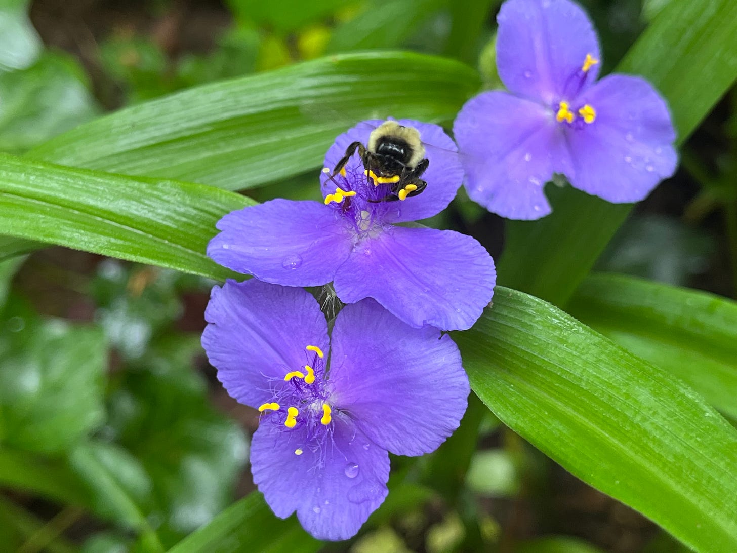 Virginia spiderwort growing along the trails at Pony Pasture, and a visiting bumblebee